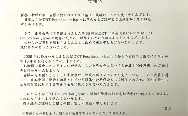 2025年5月1日fumiko.ono@assist-hoken.jp 寄付への感謝状MDRTへの寄付に対する感謝状をいただきました。 この寄付により、地域のボランティア活動や社会貢献活動に協力することができました。